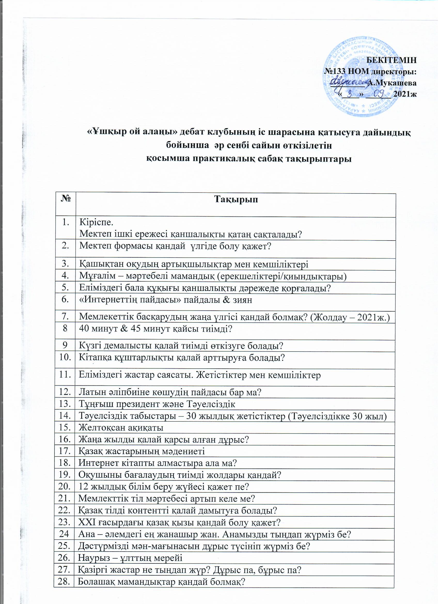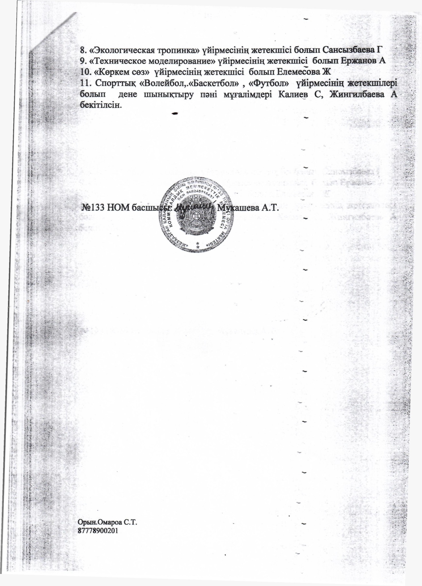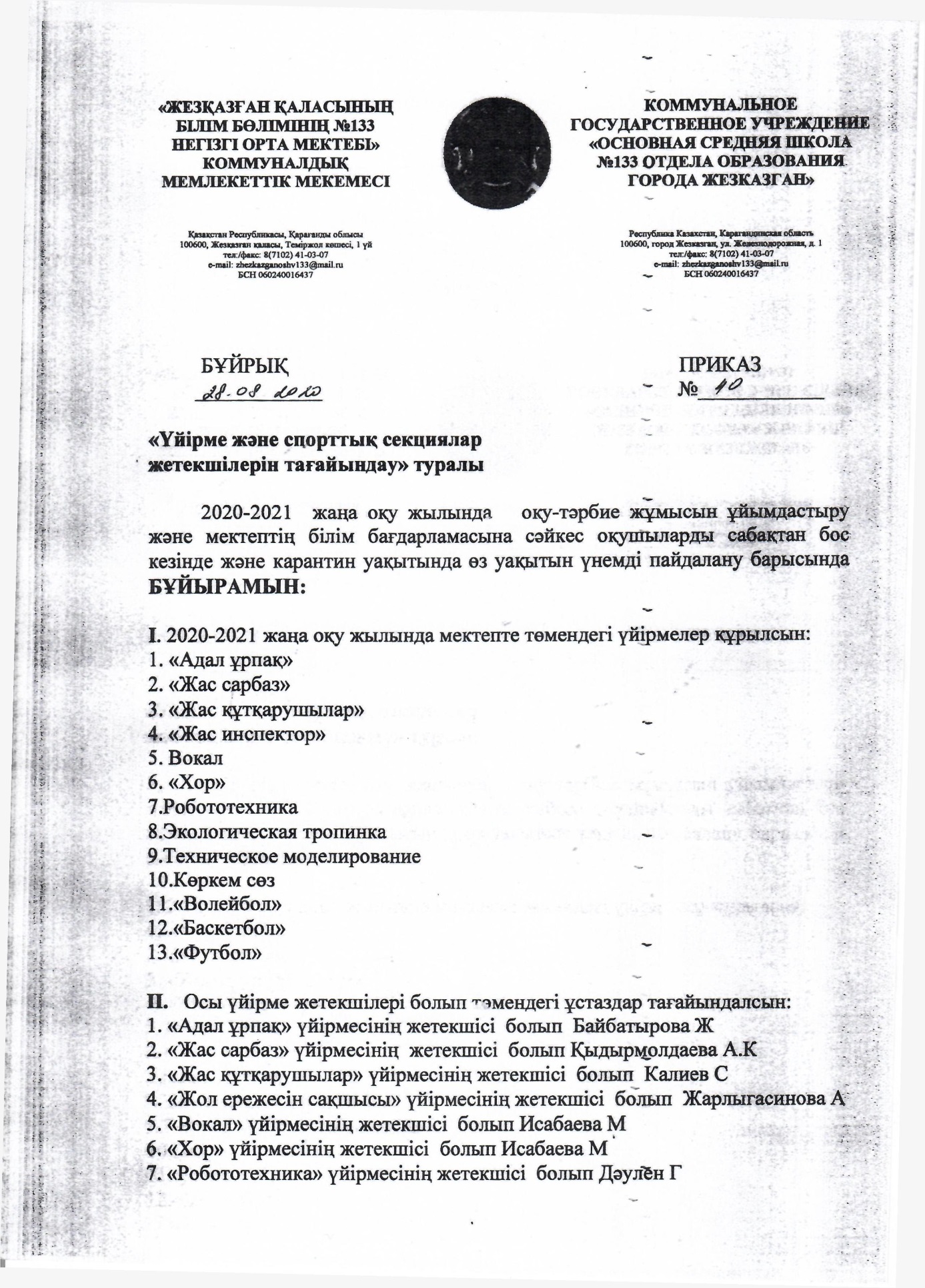 | 1 | Үйірме және спорттық секциялар жетекшілерін тағайындау, үйірме жұмысын ұйымдастыру туралы |