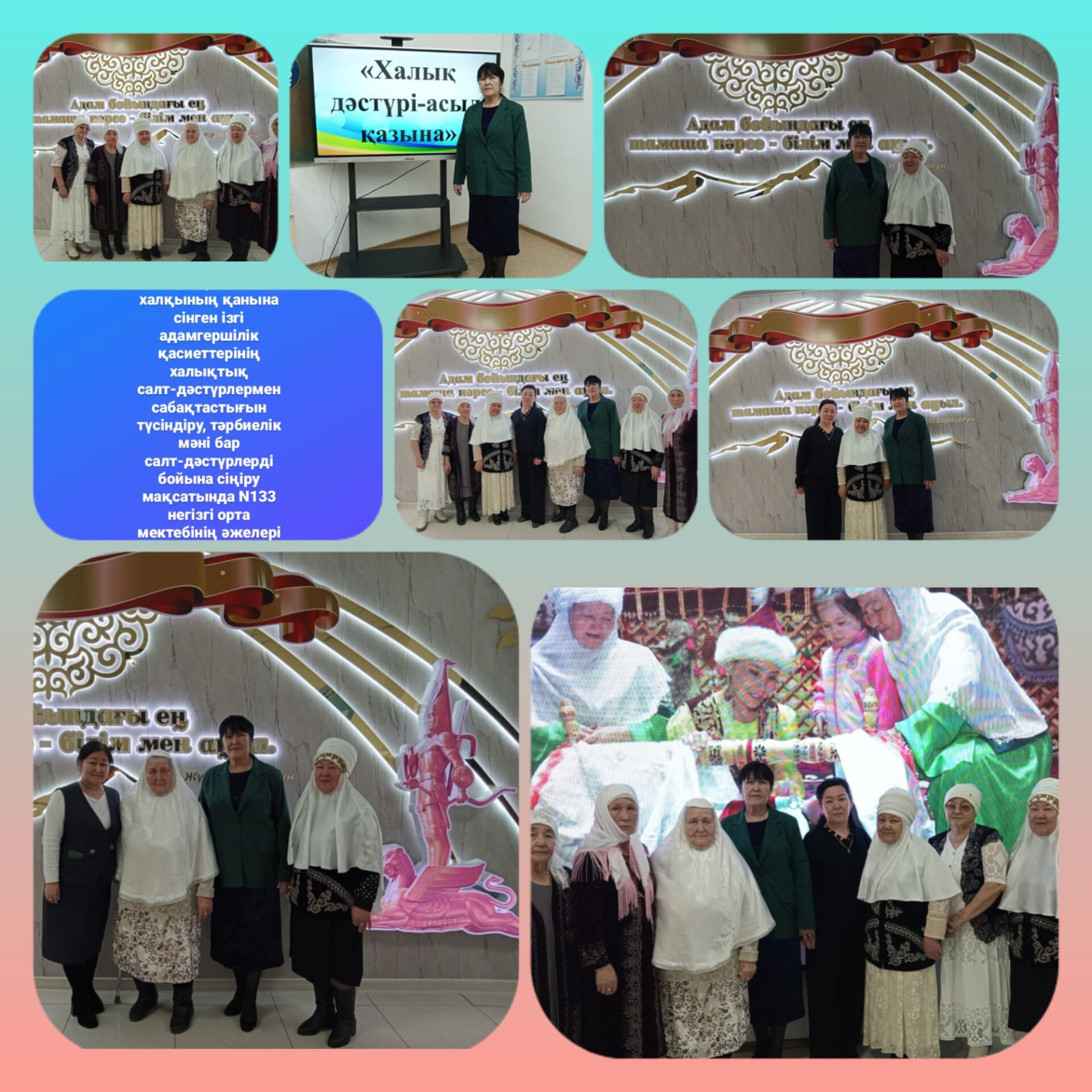 2.10.23 күні № 133 негізгі орта мектебінің 3«А» сыныбында жас жеткіншектердің бойына үлкенді сыйлап тыңдай білуге, құрметтеуге, халқының салт – дәстүрінен нәр алуға, инабаттылық пен мейірімділікке тәрбиелеу мақсатында «Қарттарым- асыл қазынам» атты сынып сағаты өткізілді.Сынып сағатына қарт кісілермен кездесу ұйымдастырылды.