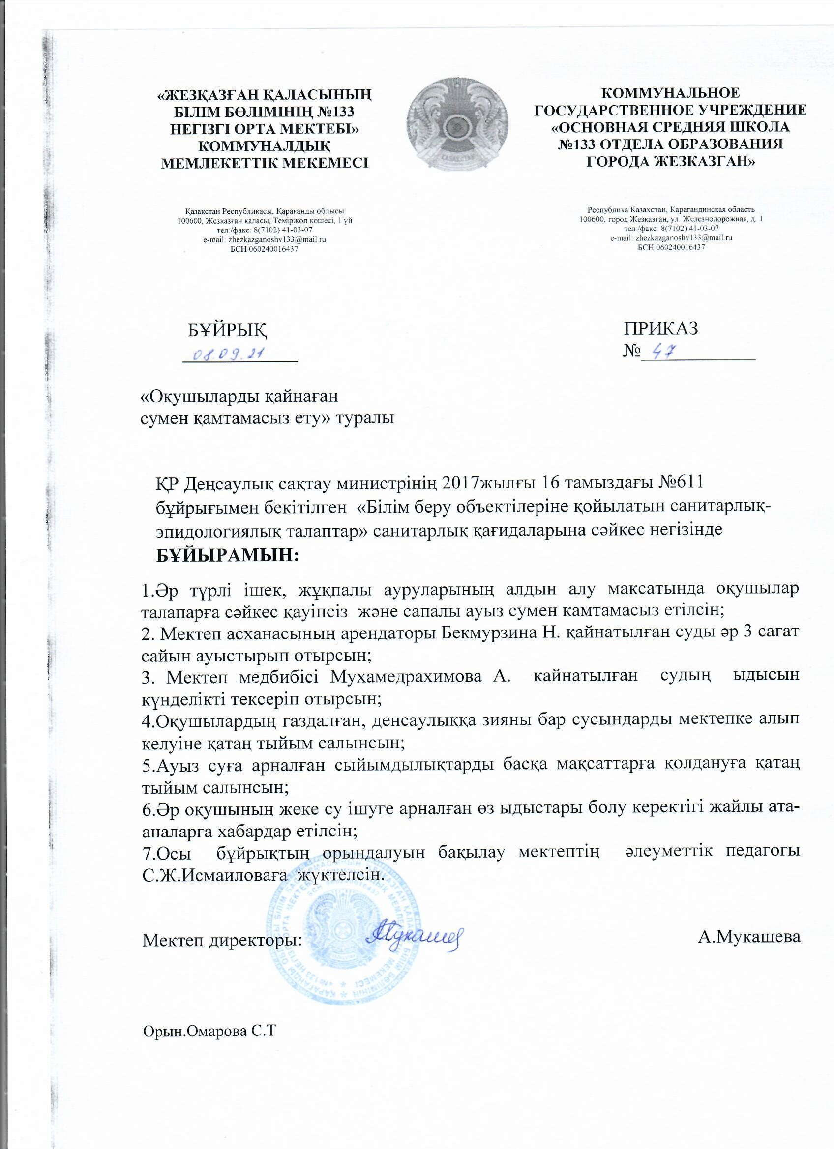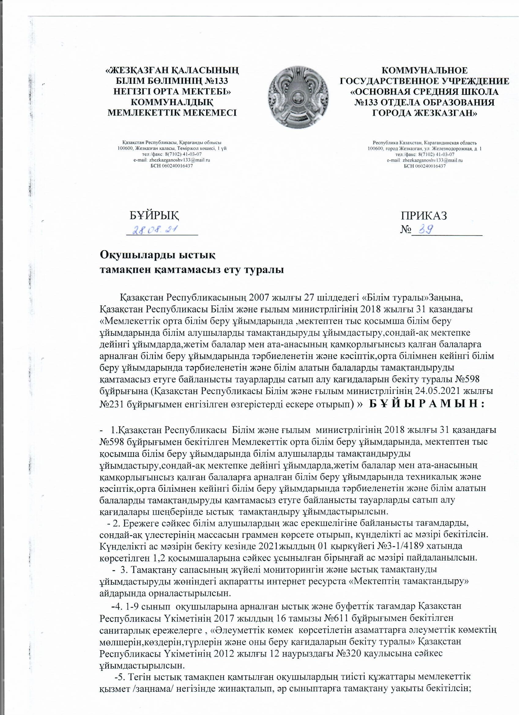 Члены межведомственной экспертной группы, утвержденной приказом Управления образования г. Жезказгана от 16 сентября 2021 года №140-Н, с 23 по 30 ноября 2021 года осуществляли мониторинг организации питания в общеобразовательных школах.
